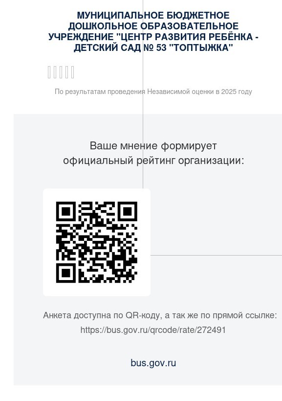 Оцените, пожалуйста, качество оказания услуг в МБДОУ «Центр развития ребенка – детский сад № 53 «Топтыжка». Для заполнения анкеты Вам необходимо пройти по ссылке: https://forms.yandex.ru/u/631dd54a5db13148c0aa1500/